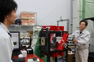 バット反発性評価装置を操作する溝口さんと浦上さん
