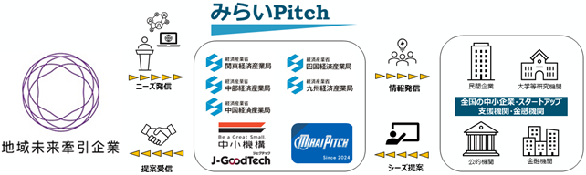 未来企業への支援の一環として、中部経済産業局、関東経済産業局、中国経済産業局及び独立行政法人中小企業基盤整備機構では、成長を目指す未来企業が、地域の垣根を越え、全国の優れた技術・サービスを有する企業等との共創及び新事業創出を目指す場として、「みらいPitch」を令和6年9月に立ち上げました。